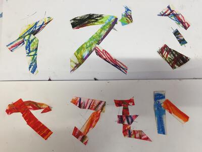 白い紙にクレヨンで模様を描き、それをランダムに切って、名前の形を作ります。
