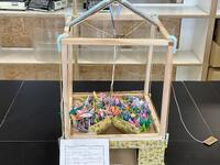 最後に紹介する作品は、4年生の佐藤さんの作品、「めざせ!金メダル」です。パリオリンピックの棒高跳びの選手の姿に感動し、工作でその感動を再現したいということで工作が始まったそうです。とんで行った人形が、ビニール袋の上に安全に着地させることが難しく、人形の重さや竹籤の長さ、角度の調整には根気強い工夫と長い時間がかかったそうです。見事に高跳びする選手も素晴らしいですが、応援の人々がいかにもオリンピックの多国籍な感じと明るく仲良く応援している雰囲気がとてもよく出ていて素敵です!佐藤さん、優秀賞おめでとうございます!