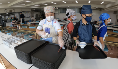 山ビンゴの後は、昼食です!関東平野を見渡せる山の中腹にある茨城中央青年の家ですが、本校からは1時間程度で行ける場所にあるので、充実した活動をおこなった後でもまだ12時!食堂は感染対策のために、全員が窓の外の景色を見ながらの食事になります。係の児童が、テキパキと仲間の食事を準備していきます!チームワークと素晴らしい働きぶりに施設の方も驚いておりました!