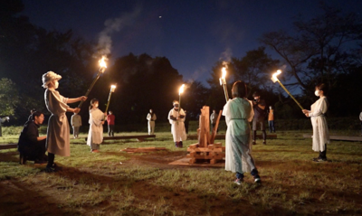 本日のメインイベントと言っていいでしょう、キャンプファイヤーです!校長が火の神を行うというのは子どもたちにとっても暗黙の了解で、事前の準備が進められていましたが、なんと森の暗闇で控えていたのは、ここにいるはずのないシークレットゲストの松本先生です!係の子どもたちは、はじめ「校長先生が隣で撮影していたら、すぐバレちゃう」とか言っていたのですが、火の神の正体が知らされると、場内はすごい盛り上がりとなり、この企画は大成功となりました!