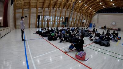 学校出発の会も体育館で行われ、出発!