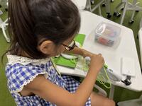 1年2組の先生は今年2年目の教員です!おそらく昨年の学級では、導入の際、理科大学の学生の支援があったのでしょう。今回は自分が説明しなければなりませんので、かなり緊張の様子で、ひとつひとつ手順を子どもたちに確認していきます!電源を繋いで、たくさんあるスイッチを間違えないように順番に操作しながら、子どもたちも準備をしていきます。子どものプログラミンングを受け付けるのは、ミニミニのボットのキューブちゃん!「命令を始める」「1歩前に進む」「命令を終わる」というようなカードの上をキューブちゃんにトレースさせることでキューブちゃんに動きを命令していきます。自分の命令がしっかりキューブちゃんに伝わると、キューブちゃんはちゃんとその通りに動いて、「よくできたでしょう!」というようにプルプルかわいく震えて喜びます!これには子どもたちもにっこにこで大喜び!