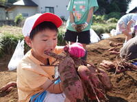 いよいよ芋掘り!お手伝いの先生方に、スコップで土をほぐしてもらって、小さな手で頑張って掘ります!出てくる出てくる大きなおいもがザックザク!「おっきいよーっ!」「せんせいみてー!」「おもーい!」あっちでもこっちでも大歓声が上がります!土の中から出てくるのは、お芋だけではありません!幼虫や、ツルを刈られて行き場を失ったバッタたちがいっぱい出てきました!収穫した芋は、お家に持って帰ったり、給食で全校の子どもたちに食べてもらったり、くろもり会頒布会を開いたりする予定です!お楽しみに!