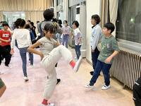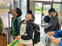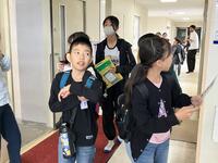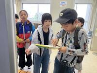 インドアビンゴは、25枚の写真をヒントに、館内のある場所を特定し、その場所の近くに貼られた虫か野菜のシールを探していくというものです。写真以外に手がかりがなく、想像するよりもかなり難しいのですが、子どもたちは、体育館に向いている矢印と、館内案内図を結びつけて考えることで、「この辺にあるんじゃないか?」と推理したり、床に這いつくばり、見る視点を変えて探してみようと工夫したりと、ここでもさすがおおぐろの森小学校という頭の使いようでインドアビンゴを進めていました。