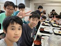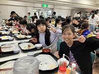 ゲームの途中ですが、先に配膳係は下の食堂に降りて、昼食の準備が始まりました!これでここに林間学園に来るのは3回目ですが、初めて見るようなものすごいスピードでお盆が並べられ、そこに次々とおかずプレートが置かれ、ご飯をテキパキとよそい、それを配り・・・素晴らしい働きの5年生でした!そのおかげで、みんなしっかりにこにこ林間学園初めての食事であるランチをいただくことができました!ここの唐揚げ美味しいですよね!