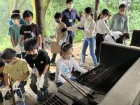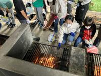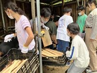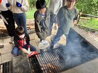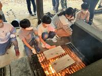 ある程度炎が大きくなったら、板を焼いていきます。やりすぎないように、しかし板の表面を炭化させるようにと、この加減が難しいのと、薪を燃やせばたいそう煙が出ますので、風向きによって目がしみたり、むせてしまったり、子どもたちには試練の時でした!