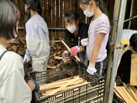 ここからは、火を使うことになりますので、焼き板指導のお兄さんが丁寧に説明してくれます!まずは竈門に火を起こすことから始めます。新聞紙を丸めて、三角屋根を作るように細い板を組んでいって・・・焚き火の基本ですね!基本を学んだら、実践あるのみ!いくら知識があっても、経験には敵わないことがこういう作業にはあるのですよね!