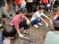美味しいお昼をいただいた後は、焼き板作りに挑戦です!まあまあ雨も落ち着いていて、傘なしでもに移動できるぐらいの霧雨が降っています。子どもたちは斜面を下って、焼き板作り会場の屋根のある第3炊事場まで森の中を進みました。係児童は荷物を持っての斜面移動ですが、慎重に慎重に滑らないように降りていきます。