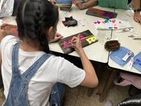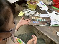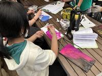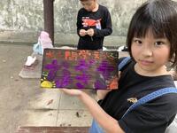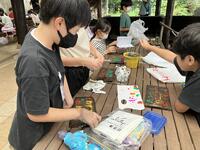 ある程度焼き上がった板は、炭になっている部分を削り、タワシで擦り、新聞紙で磨くとあら不思議!いい具合の艶がのった趣のある焼き板の出来上がりです!思い思いの絵や文字を描いて、世界にひとつの林間学園思い出の品が出来上がりました!