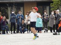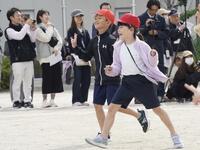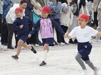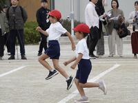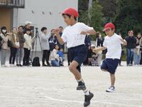 プログラム3はレク走です!「異世界混合大レク走大会」と名付けられた、先生出す表示によって、カンガルーになったりフラミンゴになったりカニになったりしながらゴールを目指す競技です!1年生のすごいところは、50m走とこのレク走の並び方が違うところ!普通だったらどちらも共通にしてしまうところを、いろいろな友だちと競走を楽しもうということで、種目ごとに並び方が違うのです!それをちゃんとこなすのが本校の1年生のすごいところ!子どもたちのつぶやきによると、カンガルーの両足跳びが最もきついとのこと!たまに、サービスの「人間!」が出ると、子どもたちは大喜びでスキップをしながらゴールしていました!