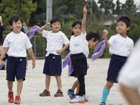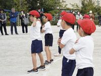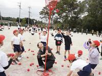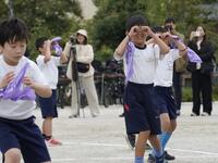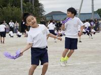 プログラム2はチェッコリ玉入れです!学年主任のK藤先生のスポーツ観戦で身につけた高らかな「20XX年オリンピック競技〜Chekkori TA•MA•I•RE〜!!」というアナウンスで決戦の火蓋が切られました!チェッコリ玉入れのルーツは諸説あるそうですが、有力なのはなんと私が教員になった40年前ぐらいに埼玉の川越あたりの小学校で生み出されたとか・・・。1年生はチェッコリを踊っては投げ踊っては投げしながら、3回戦行います!音楽がかかると、子どもたちは可愛らしく踊った後カゴ目掛けて球をバンバンなげ入れます!下で支えるのは日頃より担任を補助して子どもたちに寄り添っていただいている皆さん!たまとともに頭に降りかかる砂つぶを払うこともなく、じっとカゴを支えます!踊って投げて踊って投げて、やがて音楽が鳴り止みました。さてさて、球を数えましょう!1・2・3・・・優勝はK藤先生の1組でした!気合い勝ち〜!!