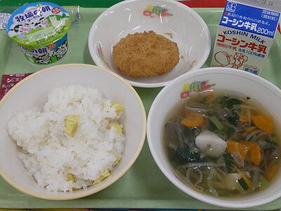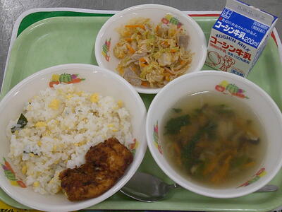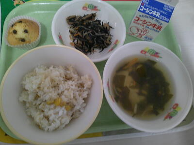 『牛乳 焼きとうもろこしご飯 ひじきの炒り煮 すまし汁 手作りチョコチップマフィン』