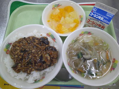 『牛乳 マーボー茄子丼 ワンタンスープ フルーツの和梨ジュレ和え』