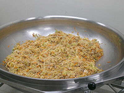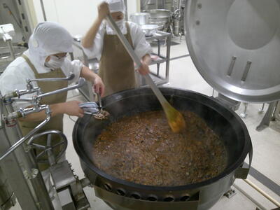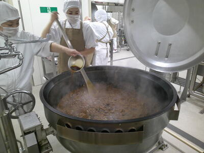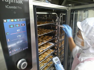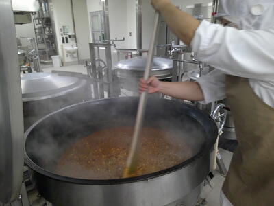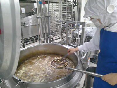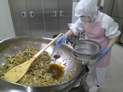 【マーボー茄子の味をととのえ、仕上げにごま油を加えましたキラキラ中心温度をはかり、できあがりキラキラ