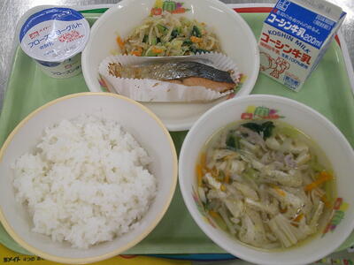 『牛乳 ご飯 鮭バターレモン醤油かけ ごま和え 沢煮椀 フローズンヨーグルト』