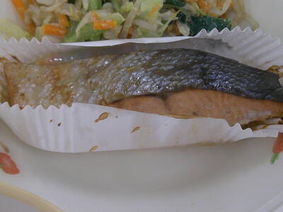 「鮭のバターレモン醤油かけ」は、今が旬の「鮭」をオーブンで焼き上げ、特製のバターレモン醤油をかけました了解鮭にバターとしょう油、レモンの風味が染みて、ご飯と相性が良いので、骨に気を付けながら、味わって食べましょう興奮・ヤッター!