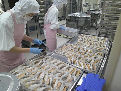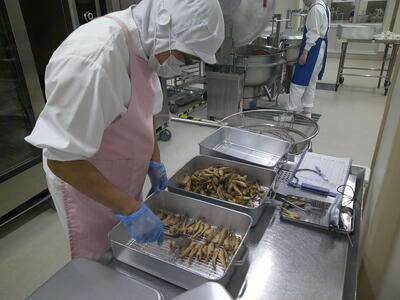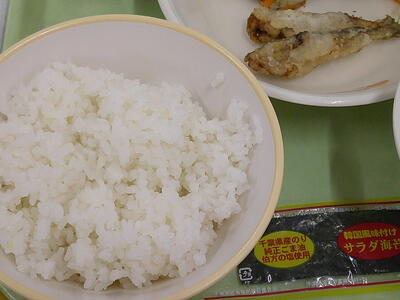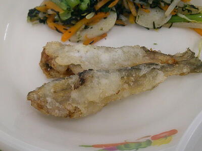 今日の「氷下魚(こまい)」は、油でじっくり揚げてあるので、頭から尾まで丸ごと食べられますキラキラ骨もやわらかいので、よくかんで、味わって食べましょう笑う