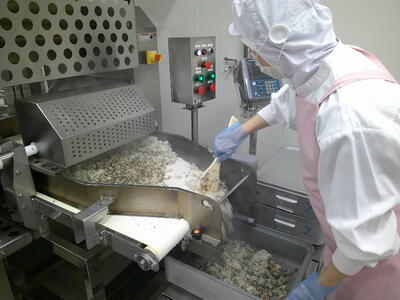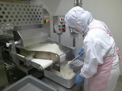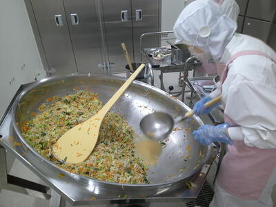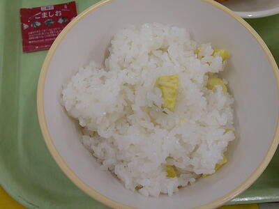 給食では、愛媛県産の栗を使用しました。給食室のコンベクションオーブンで蒸かして、炊きたての「おこわ」にさっくり混ぜ合わせましたキラキラごま塩を加減してふり、栗の味や風味を味わいながら食べましょう笑う