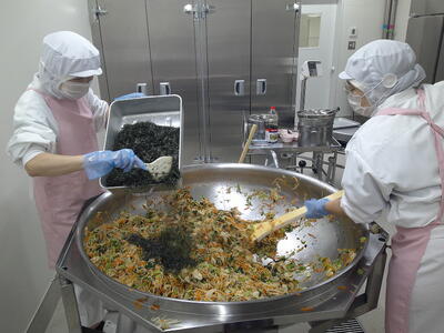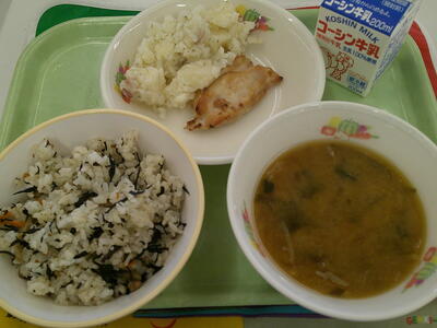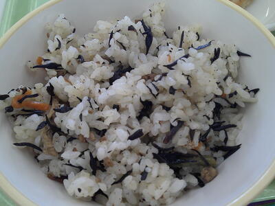 「ひじきご飯」は、乾燥したひじきを水で戻して、鶏肉や油揚げ、人参を一緒にだし汁で煮込みました了解炊きたてのご飯にさっくり混ぜ合わせ、旨みのきいた「ひじきご飯」ができ上りましたキラキラもりもり食べて、ミネラルを摂取して、健康な体をつくるように心がけましょう笑う