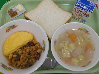 『牛乳 食パン メープルマーガリン チーズオムレツ チリコンカン ミネストローネ』