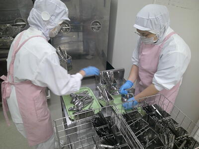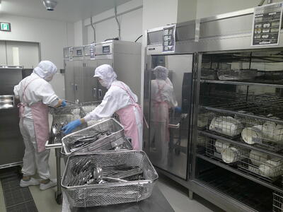 【前日に熱風消毒をした食器やスプーンを数え、クラスごとにお玉やトングをセットしますキラキラ