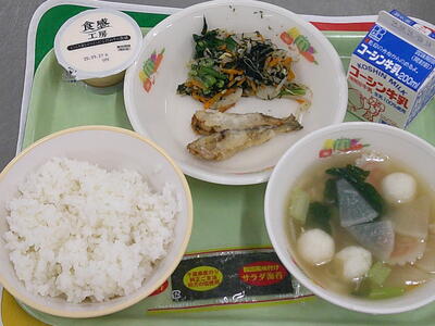 『牛乳 ご飯 韓国風焼きのり こまいの唐揚げ 磯香和え だまこ汁 プリン』