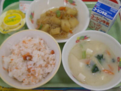 『牛乳 新巻鮭ご飯 肉じゃが 豆乳入り味噌汁 日向夏ゼリー』