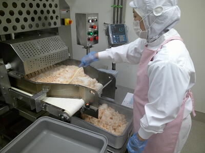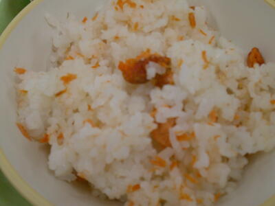 今日は、さっぱり味の「新巻鮭ご飯」キラキラ塩漬けにした新巻鮭は、発酵と熟成を繰り返し、水分が減り、旨みがアップします了解熟成された新巻鮭の半身をオーブンでじっくり焼きあげましたピース鮭の脂は、皮と身の間にあり、焼き上がった鮭を調理員さんが丁寧にほぐし、炊きたてのご飯にさっくり混ぜ合わせましたキラキラご飯と一緒に鮭の塩味と旨みを味わって食べましょう笑う