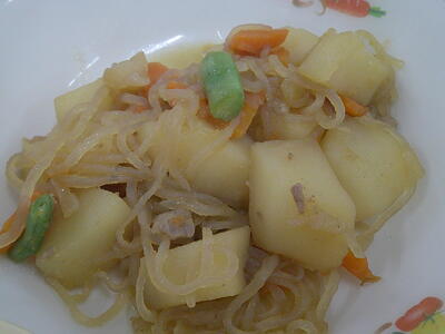 煮物の「肉じゃが」は、じゃが芋をメインに、肉や玉ねぎ、人参などを甘辛い醤油と砂糖で味付けして煮込んだ日本の家庭料理王冠給食では、だし汁と砂糖、醤油の他、酒、本みりんも加えて、じっくり煮込みましたキラキラ本みりんを加えることにより、煮くずれしにくくなったり、コクや甘みがプラスされます花丸じゃが芋に味が染みて、美味しく仕上がりましたピースホクホク食感のじゃが芋を味わって食べましょうキラキラ
