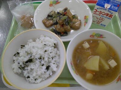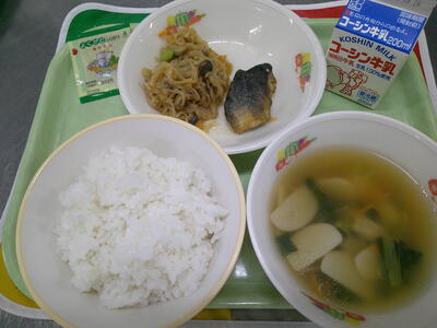 『牛乳 ご飯 かむふりかけ ほっけ一夜干し   豚肉と切干し大根の炒め煮 白玉汁』