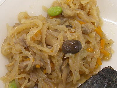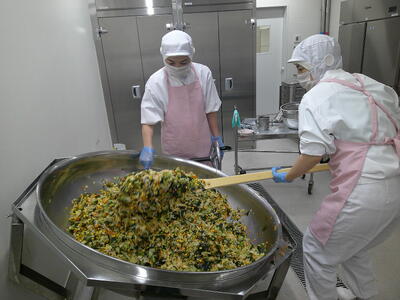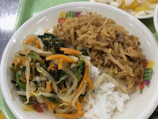 給食では、切干し大根と豚肉の炒め煮とナムルをたっぷりのせて、よく混ぜながら食べましょう了解「切干し大根のビビンバ」は、栄養バランスが大変良いので、よくかんでもりもり食べましょう笑う