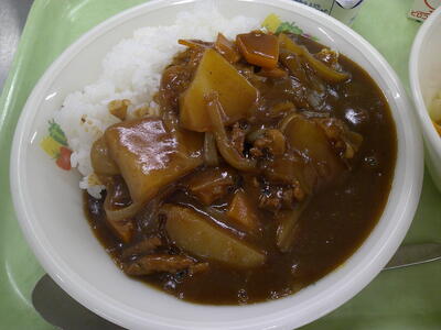 今日は人気の「ハヤシライス」ですキラキラ豚肉をたっぷり使い、玉ねぎやじゃが芋、人参も加え、栄養満点です了解仕上げに赤ワインも加え、香り豊かなルーができ上りました了解お肉だけではなく、野菜もしっかり使っているので栄養バランスがととのっています了解炊きたてのご飯にたっぷりかけて、もりもり食べましょう笑う