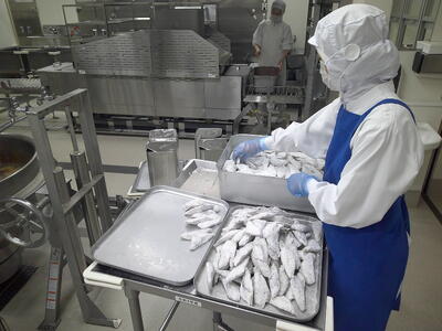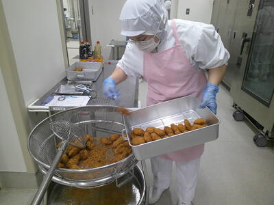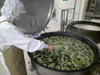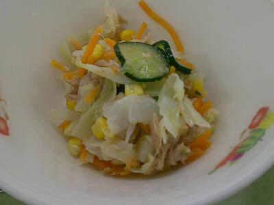 「ツナサラダ」は、新鮮なキャベツときゅうり、人参をサッと茹でて、真空冷却機(しんくうれいきゃくき)という機械に入れて、一機に10℃に冷やしていますキラキラ特製のドレッシングで和えて、たんぱく質豊富のツナも加えました了解野菜には水分が90%近く含まれていますキラキラ野菜を食べることにより、ミネラルと水分補給になるので、ツナサラダをしっかり食べて、熱中症を予防しましょう興奮・ヤッター!