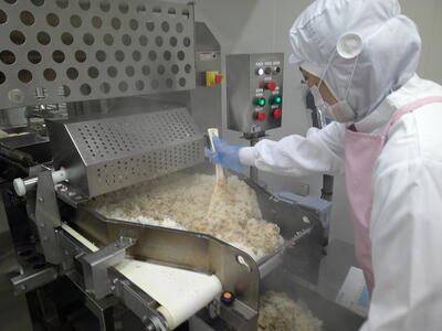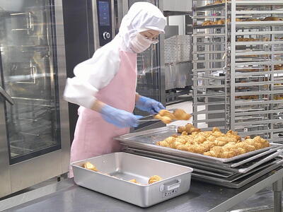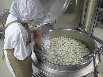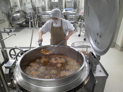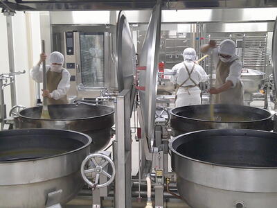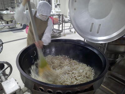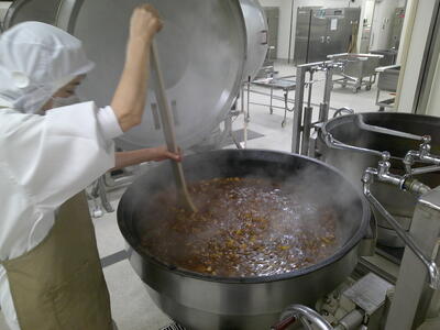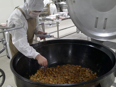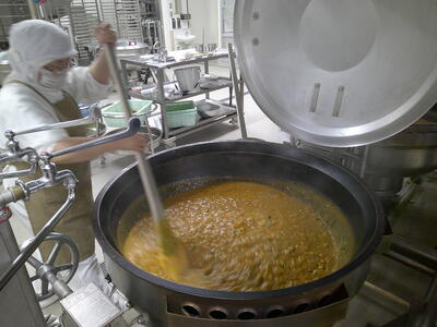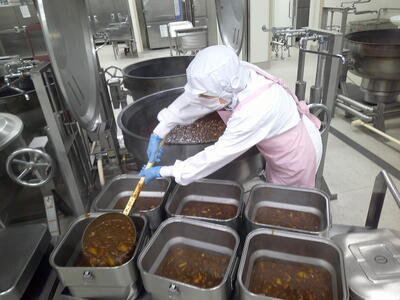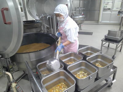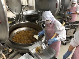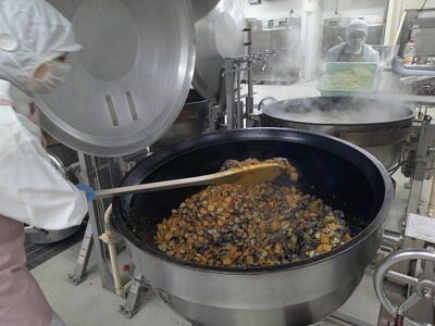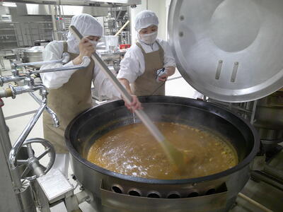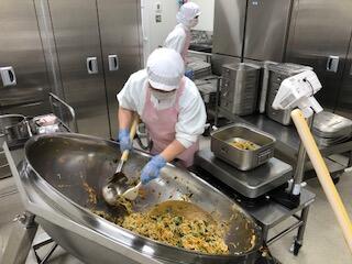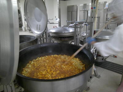今日は、人気の「チキンカレーライス」花丸手作りのカレールーは、バター9kgと小麦粉9kgを大きな釜で1時間ほどじっくり炒めて作ります了解弱火で、焦げないように時間をかけて炒めているので、クリーミーな食感風味の良いチキンカレー」ができ上りましたキラキラ暑い時は、香辛料のきいたカレーライスが、食欲をそそります花丸ご飯にチキンカレーをたっぷりかけて、もりもり食べましょう笑う