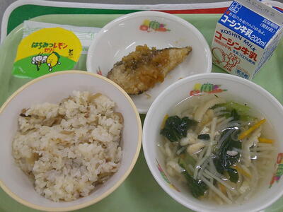 『牛乳 鶏ごぼうおこわ 鰺の南蛮漬け 沢煮椀  はちみつレモンゼリー』