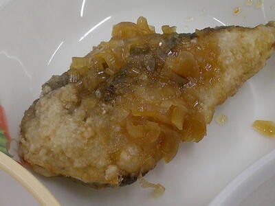 今が旬のアジを使った「鯵の南蛮漬け」は、油でカリッと揚げたアジに特製のタレをたっぷりかけましたキラキラ甘みと酸味が、アジにしっかり染みて食べやすくなっています花丸栄養満点なのでよくかんで味わって食べましょう興奮・ヤッター!