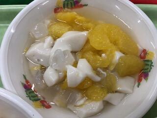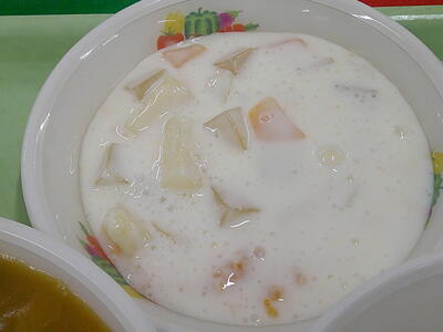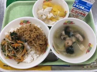 『牛乳 切干し大根ビビンバ 冬瓜エビスープ 甘夏豆乳デザート』