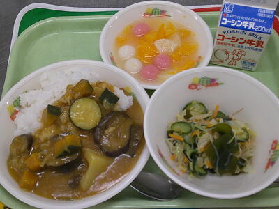 『牛乳 夏野菜カレーライス 中華サラダ ホワイトポンチ』