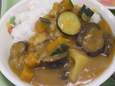 今日は、みずみずしい夏野菜を使った「夏野菜カレーライス」キラキラ夏野菜を代表する「なす」と「かぼちゃ」、「ズッキーニ」を加えました了解なすとズッキーニは、油との相性が良いので一度、油で炒めてからカレーに加えましたピースかぼちゃは、ホクホク食感に、甘みがプラスされます花丸