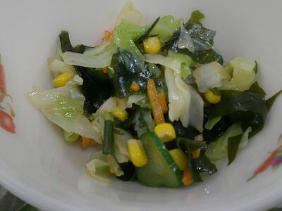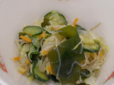 「中華サラダ」は新鮮な野菜に春雨、わかめを加え、特製の中華ドレッシングで和えましたキラキラ中華ドレッシングは、ごま油を加えた風味豊かなドレッシングになっていますピース夏バテしないために、栄養のバランスを考えて、何でも食べられるようにしましょう興奮・ヤッター!