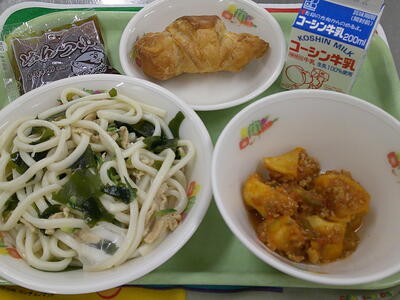 『牛乳 冷やしきつねうどん    揚げじゃが芋のトマト煮 手作りチョコクロワッサン』