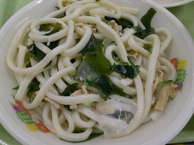 今日の主食は、「冷やしきつねうどん」ですキラキラうどんは、一度しっかりボイルしてから、水で急冷しています了解油揚げは甘辛く煮て、しっかり味を付けてから、うどんと和えましたキラキラきゅうりやわかめも加えて、ビタミンやミネラルもプラス!麺つゆをたっぷりかけて、冷やしきつねうどんをよくかんで味わって食べましょう笑う