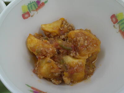 「揚げじゃがのトマト煮」は、ひき肉やトマト、玉ねぎで作ったミートソースに油で揚げたじゃが芋をさっくり混ぜ合わせましたキラキラホクホク食感のじゃが芋にミートソースが絡み、食べやすくなっていますピースじゃが芋やトマトにはビタミンCが多く含まれており、免疫力を高めますキラキラミートソースをからめながら食べましょう興奮・ヤッター!