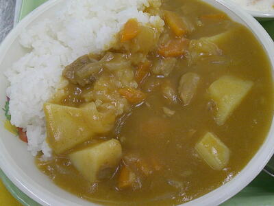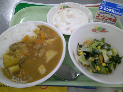 『牛乳 チキンカレーライス 海藻サラダ フルーツのヨーグルト和え』