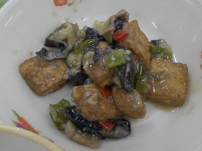 茄子は油との相性がよく、今日は、油で揚げて、特製の酢醤油をからめました。さっぱりとした酢醤油が、ご飯にとてもよく合います了解