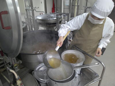 【だし汁は削り節を煮立て、こし器で丁寧にとっていますキラキラ旨みのきいた美味しい豚汁ができあがりましたキラキラ