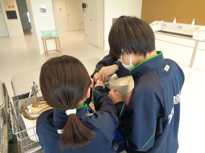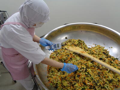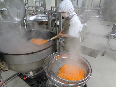春雨スープの仕上がり量は、全校で160ℓです各クラスにバランスよく配缶していきます