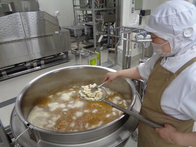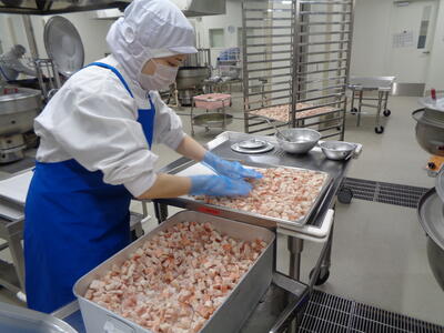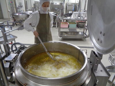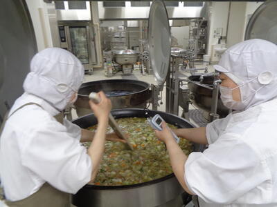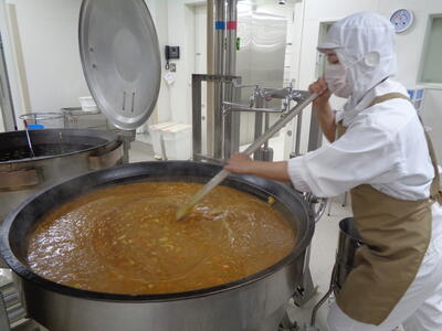 今日は、おおぐろの森中学校人気№2の「チキンカレーライス」鶏肉を使ったコクのあるおいしいカレーができあがりました。手作りのカレールーは、バター6kgと小麦粉6kg、カレー粉を1時間ほどじっくり炒めて作ります!マイルドな風味とピリッとした辛さ、野菜の甘みが味わえます