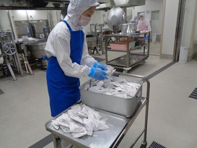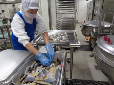 西京みその風味が、ほんのり染みています。骨がありますので、よくかんで食べましょう
