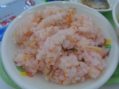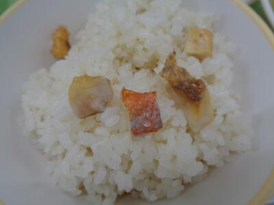 今日は、1年生を迎え、4月の「おめでたい」季節にちなんだ「鯛めし」お米を炊く時に、鯛からとった鯛だしと日本酒、塩を一緒に炊き込みました。鯛の旨みと風味がたっぷり染み渡ったご飯が炊きあがりました